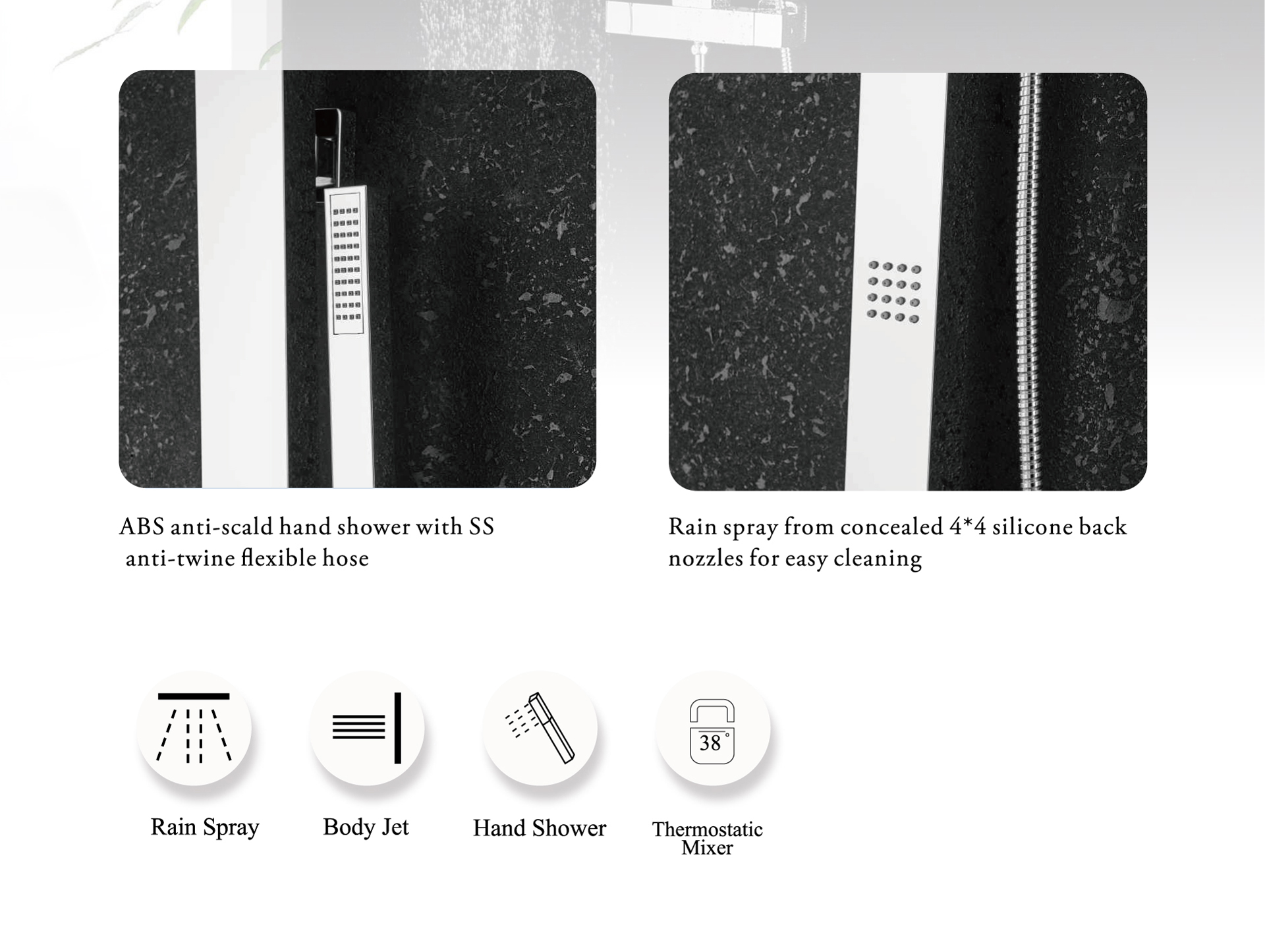 ● Stainless steel shower arm with SS ultra-thin shower head and concealed body jets can massage every inch of your skin, relieving fatigue and reinvigorating you.